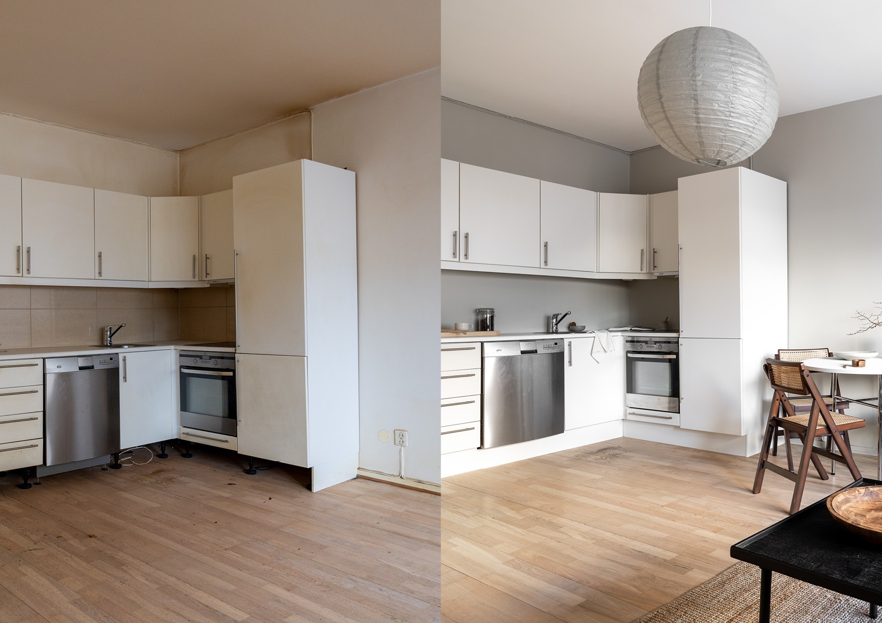 Etter at boligen var tømt, gikk vi i gang med å forvandle den. Vi gav veggene en ny fargepalett som skulle gi rommene et friskt og moderne preg. Gangen og soverommet ble malt i "Frostrøyk", mens det andre soverommet ble malt i "Antwerp Beige". Stuen ble malt i "Soothing beige", som er veldig i tiden nå, mens kjøkkenfrontene ble malt i "Frostrøyk" (alle fargene fra Lady Pure Color).